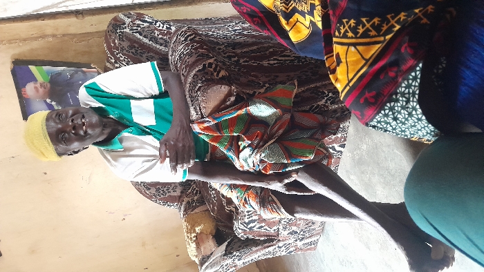 An elderly individual is seated in a worn, patterned armchair within an indoor setting in Karshi, Nigeria