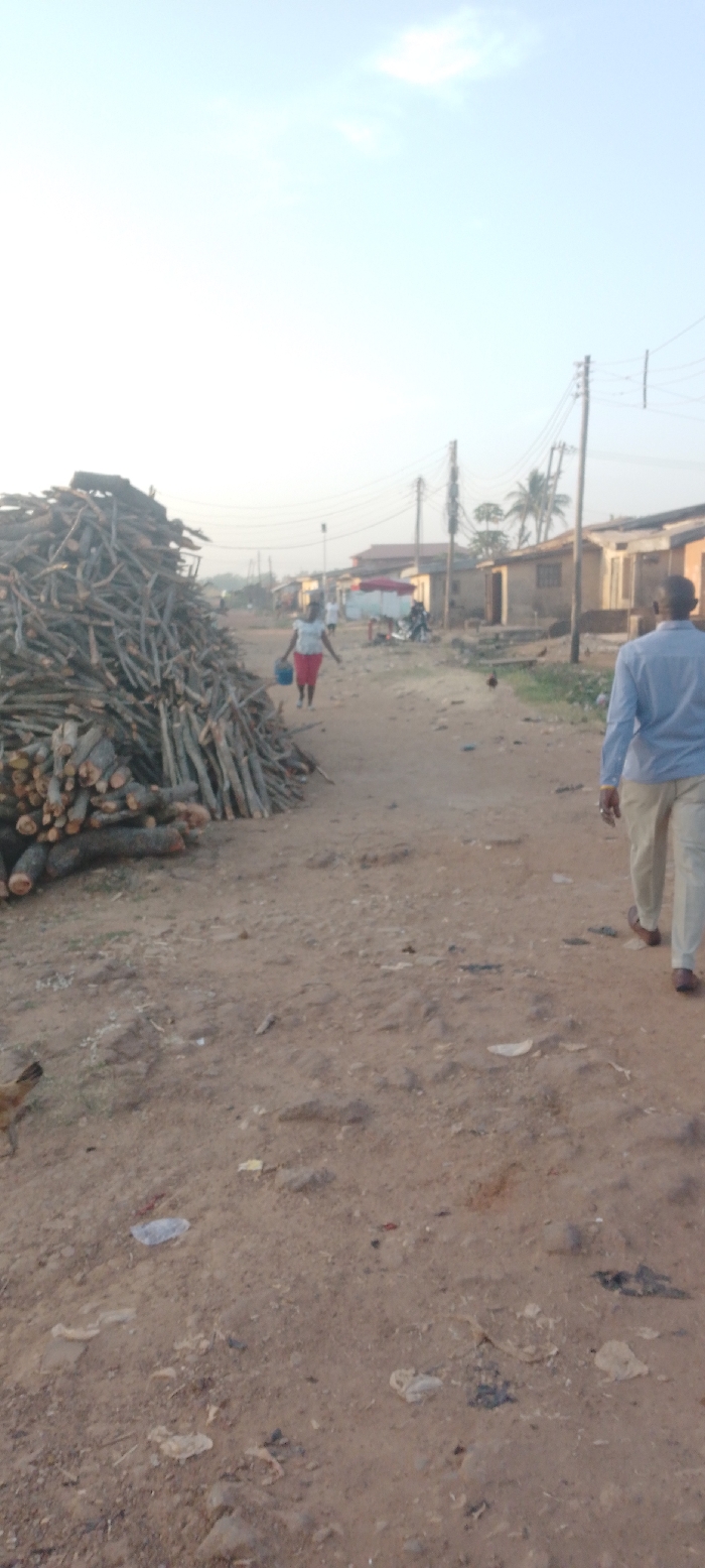 A dirt road runs through a village, lined with simple houses and utility poles. A large pile of logs rests beside the road. A woman carrying a blue bucket walks away, while a man in a light blue shirt and khaki pants walks towards the viewer. Litter is scattered along the ground. A chicken pecks in the dirt. The sky is pale.