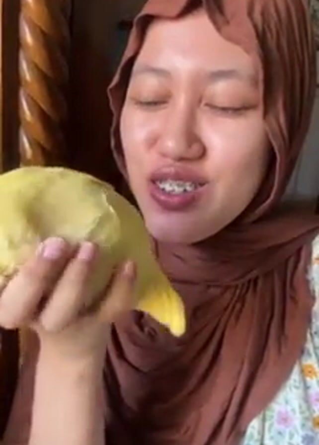 A person wearing a brown hijab is shown holding a large chunk of durian and eating it