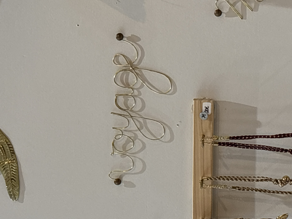 The image depicts a section of an interior wall, likely within a retail establishment in Le Puy-en-Velay, France. Centrally displayed is the word "voyage" formed from golden wire in a cursive script, affixed to the light-colored wall with two small, dark, spherical studs at each end. A distinct shadow is cast by the wire inscription. Above and to the left, a portion of a larger, golden, feather-shaped metallic ornament is visible. Below the "voyage" inscription, a horizontal wooden rail serves as a display fixture, from which multiple items of jewelry, including necklaces with golden chains and dark braided cords, are suspended. A small, rectangular white price tag is attached to the right side of the wooden rail, displaying "20€". To the far right, a partial view of another golden wire ornament is visible. The wall itself appears to be a plain, light-colored surface with minor surface imperfections. No individuals are present in the frame.
