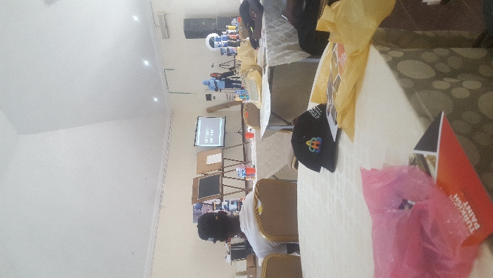 The image captures an indoor event, likely a workshop or product demonstration, in Jos, Nigeria
