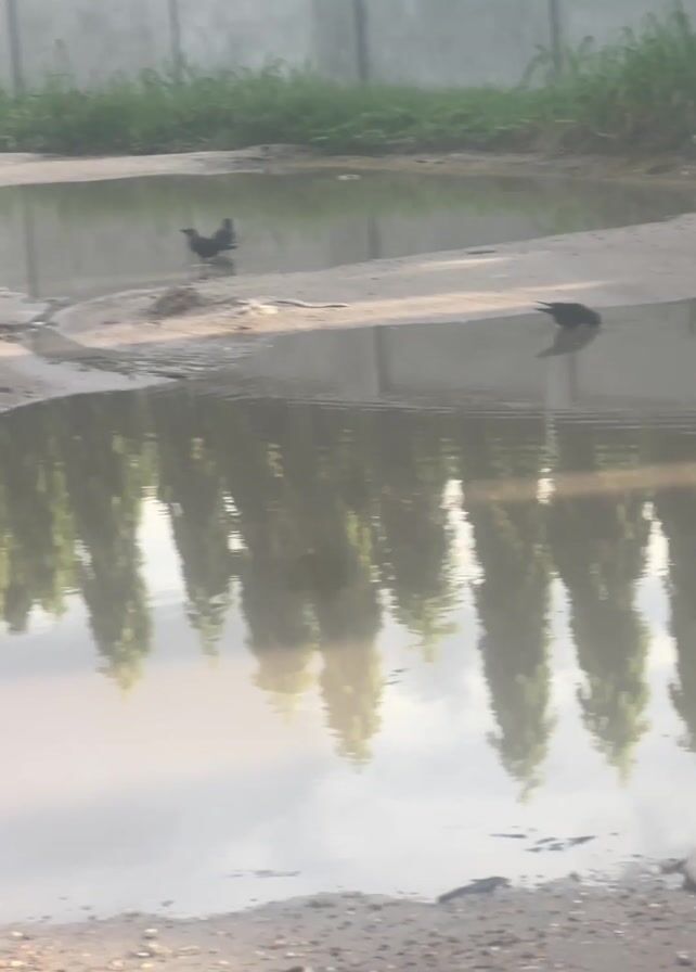 landscape featuring puddles of water reflecting trees. There are three black birds wading in the water. In the background is a concrete wall with grass growing along its base. The ground is dirt and gravel.
