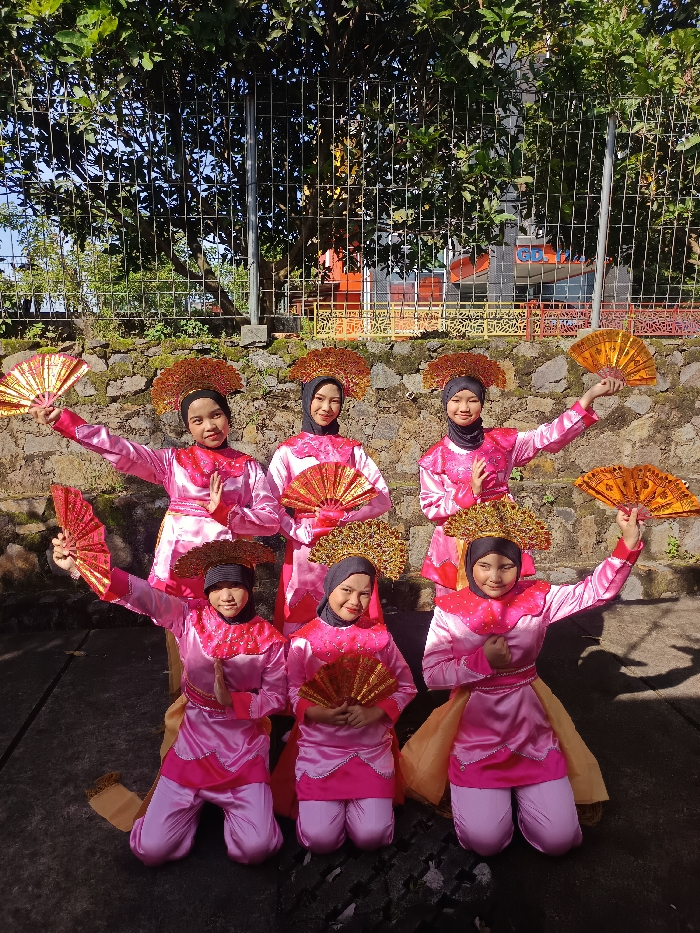 Six young women are posing outdoors in bright sunlight. They wear matching shiny pink costumes with gold accents and ornate golden headpieces. Each holds a large folding fan, some red, others gold. Three are standing, three are kneeling on the ground. Behind them is a stone wall topped with a metal fence and green foliage. Behind the fence, part of a building is visible.