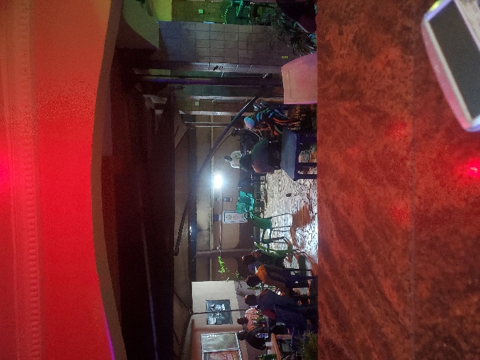 An outdoor space at night is filled with people sitting at tables and chairs. Some are conversing, others are engrossed in their phones. The area appears to be under a roof or some sort of architectural overhang, with visible beams and supports. A red light is cast on the left side of the frame, adding a warm glow to the scene. A device with a screen is in the upper right corner.