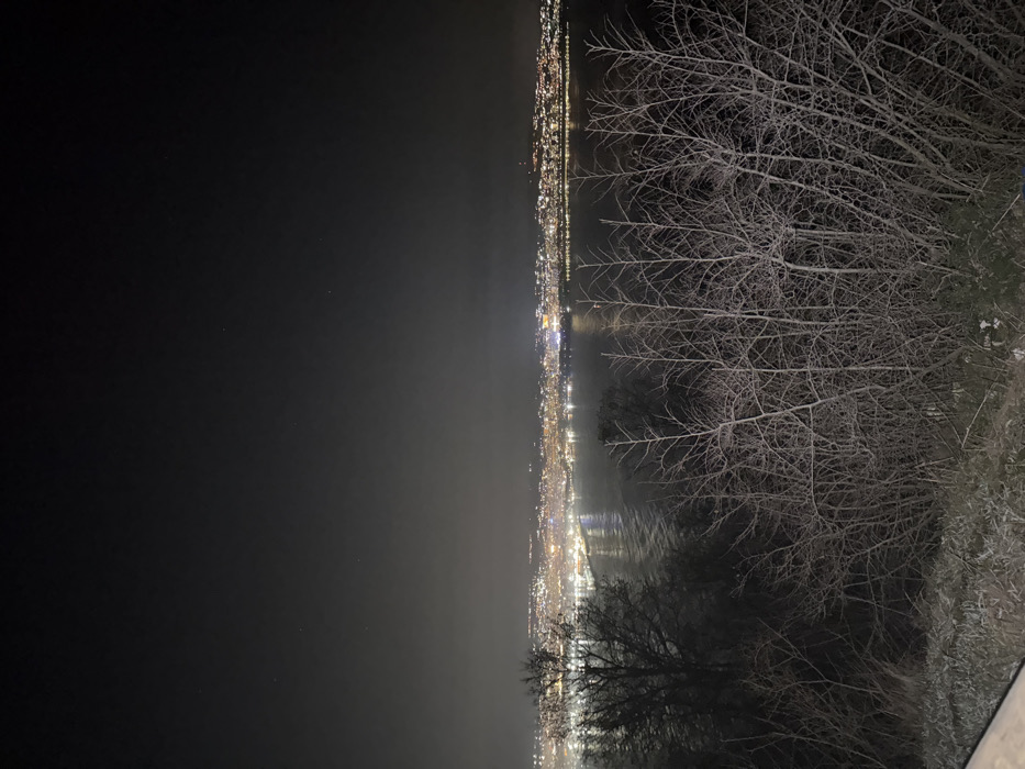 The image presents a nighttime panoramic view of the city of Varna, Bulgaria, observed from an elevated position. The foreground is dominated by a collection of bare-branched deciduous trees and bushes, appearing dark against the illuminated background, with a prominent, larger leafless tree situated on the left. Below these trees, sparse, dark vegetation is visible on the sloped ground. Beyond the immediate foreground, a wide expanse of water, consistent with Varna Bay, occupies the midground. The water's surface reflects the city lights, creating elongated, shimmering patterns. The background reveals the sprawling urban landscape of Varna, brightly illuminated by a multitude of artificial lights from buildings, streets, and infrastructure. These lights form a continuous glow along the horizon, extending along the coastline and further inland. A discernible, brightly lit pier or similar structure is visible extending into the water from the city's left side. The sky above is dark, showing faint starlight in the upper regions, with a subtle glow of light pollution emanating from the city closer to the horizon. No individuals, vehicles, or specific actions are identifiable within the scene.