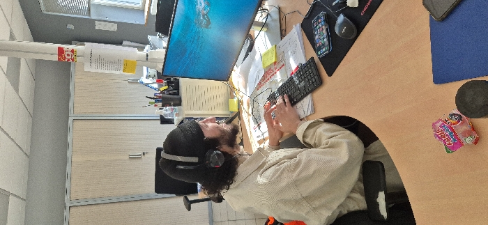 The image depicts an indoor office environment in Carvin, France, featuring a male individual working at a light-colored desk