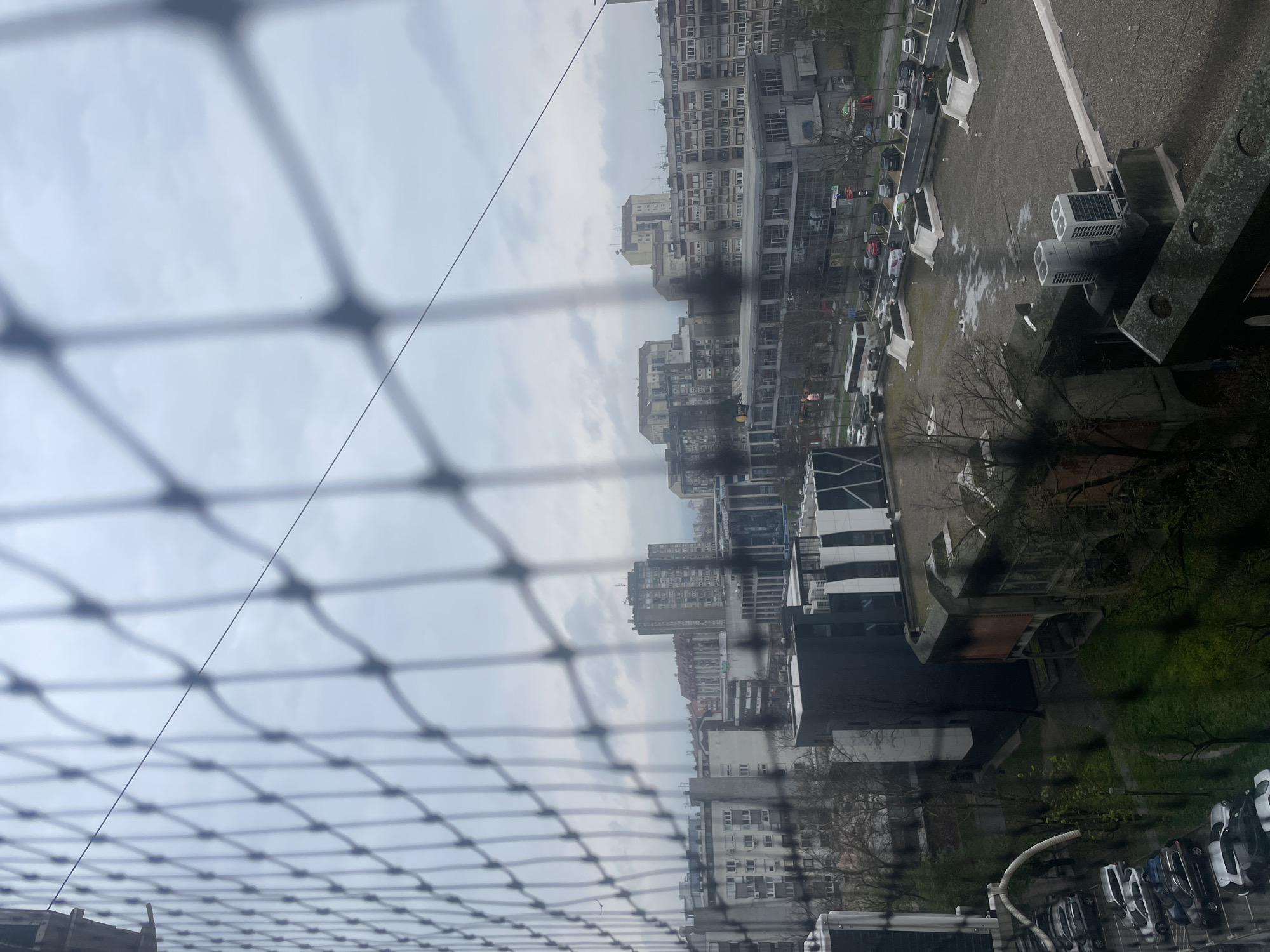 The image presents an elevated, wide-angle view of an urban landscape in Novi Sad, Serbia, observed through a prominent, blurred protective net in the foreground. The net features a uniform, dark grey, diamond-shaped grid pattern. The sky above is entirely overcast, exhibiting a uniform light grey tone. The mid-ground and background reveal a dense arrangement of multi-story buildings, predominantly commercial and residential. These structures display varied architectural styles, ranging from older, blocky concrete buildings with multiple window rows to more modern constructions featuring dark facades and glass panels. Below the main building clusters, a street with vehicular traffic is visible, including a white articulated bus and numerous parked cars in an adjacent lot. Several other parking areas contain additional vehicles. Exposed rooftops of lower buildings show flat, grey surfaces, some with white outdoor air conditioning units and large, white, possibly tarp-covered structures. Green spaces with numerous bare deciduous trees and some patches of grass are interspersed between buildings and along pathways. One small, indistinct bird is captured in flight in the upper left quadrant of the scene, behind the netting. A thin, dark cable or wire traverses diagonally across the foreground net, from the upper left towards the lower right. Wet patches on rooftops and ground surfaces indicate recent precipitation. No discernible human figures are clearly visible or engaged in specific interactions.