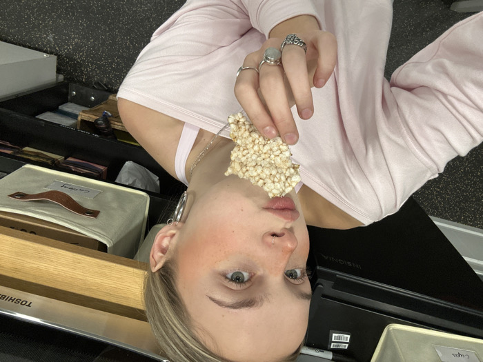 A woman in a pink top holds a rice cake up to her mouth. She has blonde hair, fair skin, and wears silver rings and hoop earrings. She looks directly at the camera with a slight smile. She is inside, positioned next to a black cabinet or drawer containing various items. A beige fabric bin with a handle sits in the cabinet, labeled "Cartoni". A black laptop with the word "INSIGNIA" printed on it is also visible.