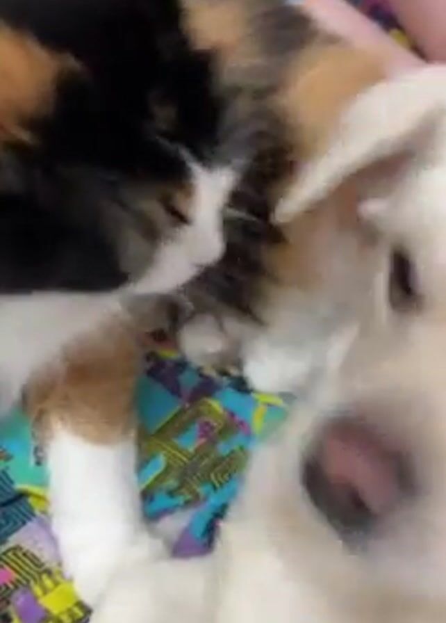 - "A close-up shot shows a calico cat grooming a white dog" by FM-yfHk32, licensed under CC BY 4.0