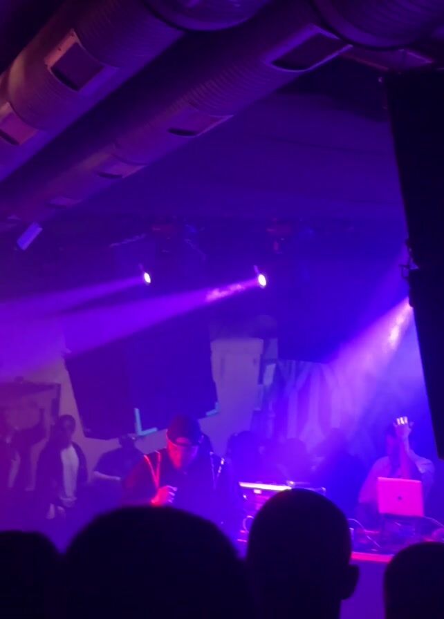 performance in a dimly lit club or concert venue, with several people silhouetted. Purple stage lights shine on the central figure, a performer wearing a cap and standing at a microphone. Behind him, a DJ works at a laptop. The club has exposed ductwork. The perspective is from the crowd, looking up towards the stage.