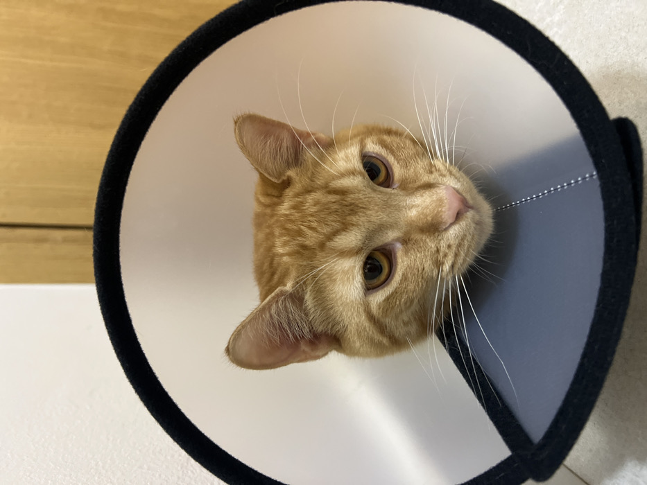 - "An orange tabby cat wears a white and gray Elizabethan collar with a black trim" by FM-eoZb83, licensed under CC BY 4.0