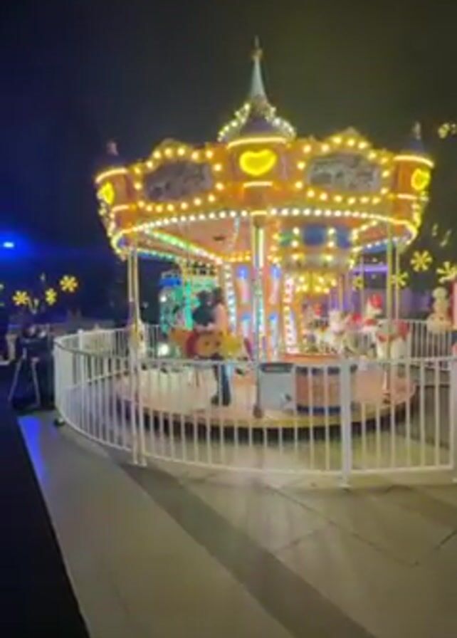 lit-up carousel at night. The carousel is surrounded by a white fence. People can be seen riding on the carousel, including a couple in the center. The carousel is decorated with lights and has a golden crown-like top. There are illuminated decorations in the background. The ground around the carousel is paved.