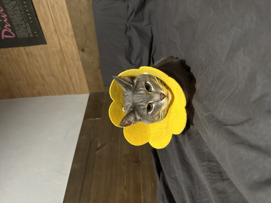 - "A gray tabby cat with green eyes wears a bright yellow, flower-shaped Elizabethan collar on dark gray bedding" by FM-HdjVs2, licensed under CC BY 4.0