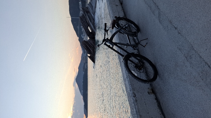 A static image captured in Podličak, Montenegro, depicts a coastal environment at either dusk or dawn. In the foreground, a dark-colored bicycle, equipped with disc brakes and a brown-toned seat, is parked on a textured concrete pathway, resting on its extended kickstand. A low concrete retaining wall separates the pathway from the water. The midground features the calm sea, with distinctive, layered rock formations partially submerged near the right coastline. Distant buildings and a tall, thin white pole are visible along the shore in the background. The sky transitions from warm orange and pink hues at the horizon to a pale blue overhead, marked by a single white aircraft contrail traversing diagonally across the upper portion of the frame. No human subjects or discernible activity are present.