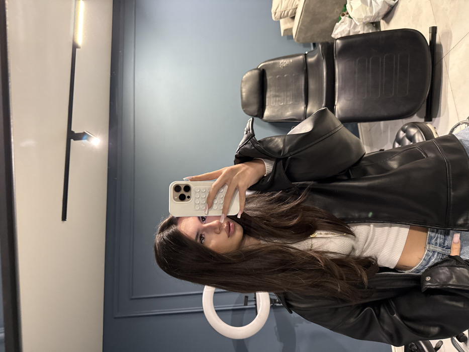 A young adult female is depicted in a mirror selfie, seen from the chest up. She has long, dark brown hair parted in the middle and a neutral expression, looking directly into the smartphone she holds in her right hand. The smartphone, enclosed in a light-colored, textured case, features a multi-lens camera array. Her fingernails are long, square-tipped, and coated with light-colored polish. She is dressed in an open black faux leather jacket over a white ribbed crop top that exposes her midriff, and blue denim jeans. A delicate gold-colored necklace is visible. To her left, a white circular ring light stands on a support. The background reveals a room with blue-grey walls featuring a horizontal molding strip, and light-colored tiled flooring. Overhead, a black track lighting system with multiple spot fixtures is reflected. To the right, a black multi-sectional upholstered chair, consistent with a treatment or tattoo chair, is present, alongside a partial view of a light-colored upholstered sofa and white plastic bags on the floor. This indoor scene is located in Yerevan, Armenia.