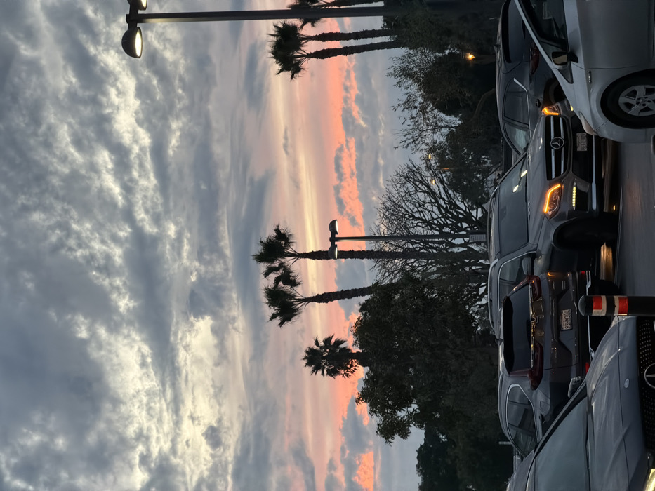 A sunset paints the sky with pink and orange hues, contrasting with the gray, cloudy sky. Palm trees stand silhouetted against the colorful backdrop. The view appears to be from a parking lot, with several cars lined up, including a Mercedes-Benz. A streetlight is visible, suggesting the onset of evening.