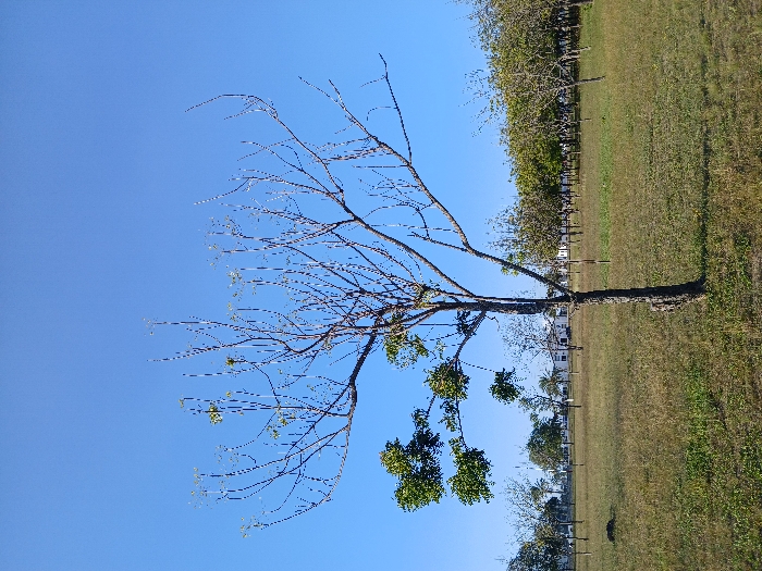 A tree stands prominently in a grassy field under a clear blue sky. The tree's trunk is sturdy, and its branches are a mix of bare twigs and green leaves. Some branches extend upwards towards the sky, while others droop downwards. In the background, a row of trees borders the field. The grass is a mix of green and brown, suggesting a change in seasons.