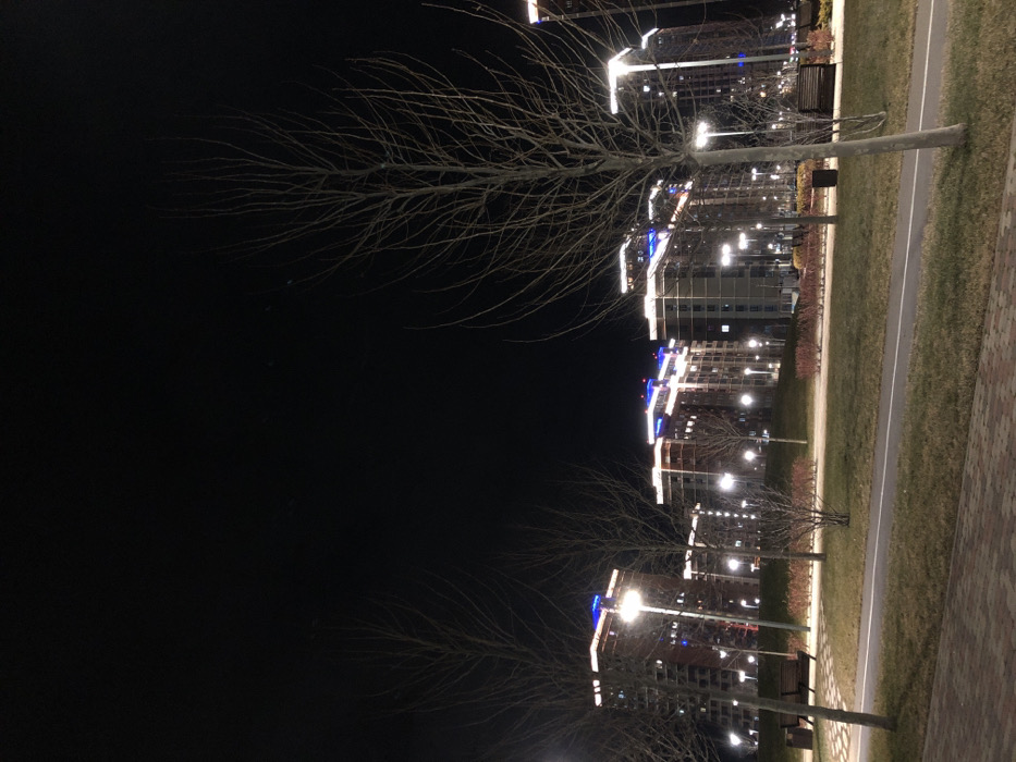 A dimly lit park scene at night features a walking path bordered by grass and a brick-laid surface. Bare trees line the path, their branches reaching toward the dark sky. Modern buildings in the background are illuminated with decorative lights, providing a stark contrast to the natural elements. Street lamps cast a warm glow on the scene, contributing to the quiet and tranquil atmosphere of the park at night.