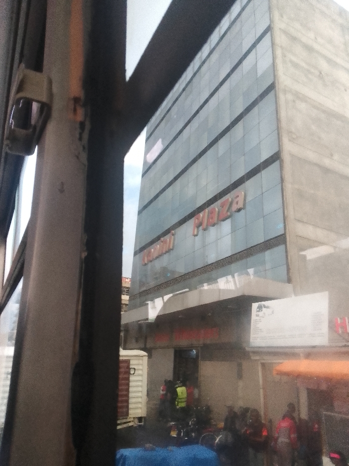 The image presents a street-level view, framed on the left by a grey vehicle interior element, including a light-colored clip. The central subject is "Jubilee Plaza," a multi-story commercial building featuring a reflective glass facade with horizontal dark bands and a grey concrete side section. Large red dimensional letters spelling "Jubilee Plaza" are affixed to the glass facade, with smaller red letters forming "Gemini" visible below. At the building's ground level, beneath a dark overhang, an entrance area is visible. To the right of the entrance, a large white sign displays text and a graphic of a white van. Numerous individuals are present at street level; one person wearing a bright yellow/lime green high-visibility vest stands near a cluster of motorcycles parked directly in front of the building's entrance. Further to the right, beneath a light orange awning, several other figures are visible, some dressed in red clothing. A white truck or container is partially visible on the far left, behind the ground-level activity. A blue tarp covers an unseen object in the lower foreground of the image. The sky is a light grey, indicating overcast conditions. The depicted location is Jubilee Plaza, situated in London Ward, Eldoret Municipality, Uasin Gishu County, Kenya.