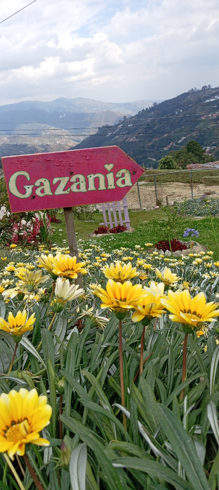 The image displays a vibrant flower garden located in Colonia Tovar, Venezuela, under an overcast sky. In the foreground, a dense cluster of yellow and orange gazania flowers with dark brown centers and elongated green leaves occupies the lower half of the frame. In the midground, a reddish-pink wooden arrow-shaped sign points to the right. The sign is mounted on a wooden post and features the word "Gazania" in light green script, adorned with small green hearts and black bee illustrations. Behind this sign and the primary flower bed, a grassy area contains beds of red flowers, scattered white and yellow blooms, and a short, light purple picket fence. Further back, a wire fence encloses a cultivated field, with a single purple Agapanthus-like flower visible on the right. The background reveals a panoramic view of verdant, undulating mountain ranges, sparsely dotted with houses and structures, and traversed by multiple horizontal utility lines. The sky is predominantly covered with white and gray cumulus clouds. No individuals or specific actions are discernible within the scene.