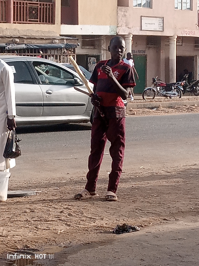 The image depicts an urban street scene in the city of Muhammadu Dikko Stadium, Nigeria, under bright daylight. In the center, a young male, likely a teenager, stands on an unpaved, dusty shoulder of a road. He has dark skin and short hair, and is wearing a red and black horizontally striped short-sleeved t-shirt with a logo resembling that of a sports club (e.g., Flamengo) on the left chest. He wears maroon-colored long trousers and light-colored slides or sandals. His left hand holds a long, light-colored wooden stick or rod vertically, while his right hand holds a shorter, darker, flat object near his chest. He faces slightly right but looks directly towards the camera with a neutral expression. To the far left, partially visible, is a person wearing a long white garment, holding a black plastic bag in their left hand, with a white bucket or container partially seen at their feet. Behind this person, on the paved road, is a silver four-door sedan (resembling a Peugeot 206). In the background, on the right side of the road, another person in a white t-shirt is walking away from the camera. Further back, two motorcycles are parked on the side of the road, one red and chrome, the other darker. Across the paved road, several multi-story buildings are visible. One building prominently displays signs, including "PAYMENTS," "LIGORA," and "ERS & PRINTING," indicating commercial establishments. The buildings feature weathered facades in tones of beige, light brown, and pinkish hues, with some upper-floor windows and a balcony with metal railings. The immediate foreground and roadside are characterized by uneven, dry, reddish-brown earth. A small pile of dark, crumpled material lies on the ground to the right of the central subject's feet.