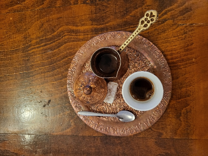- "A traditional Bosnian coffee service is arranged on a reddish-brown wooden table, presumed to be in Trebinje, Bosnia and Herzegovina" by FM-ngoIJ3, licensed under CC BY 4.0