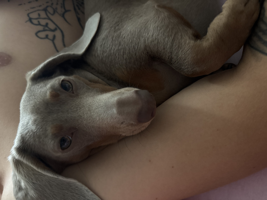- "A close-up photograph captures a greyish-tan (silver dapple or blue) short-haired Dachshund dog resting against the upper body of an individual" by FM-wUxim1, licensed under CC BY 4.0