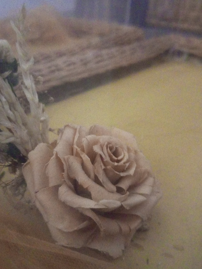 The scene, located in Zee Pin Kone, Myanmar, depicts a static, close-up view of an artificial floral arrangement. A single, light beige, multi-petal rose, likely constructed from paper or fabric, is centrally positioned on a pale yellow, smooth surface. To the immediate left of the rose, a cluster of dried, light-colored botanical sprigs or grasses is visible, intermingled with a small, dark, undefined object. The background is out of focus, revealing a horizontal brown, textured element in the upper mid-ground, consistent with wood grain or woven material. The uppermost portion of the background presents a blurred, light blue-grey field. No human subjects, animals, or observable actions or interactions are present. The ambient lighting is soft and diffused. The image exhibits minor digital noise.