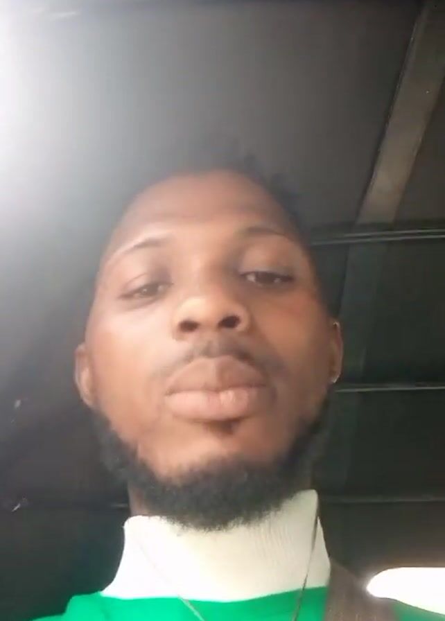 A close-up shot shows a Black man with short, dark, textured hair and a beard. He is wearing a green turtleneck sweater and a thin necklace with a cross pendant. He's inside a vehicle, possibly a car, as evidenced by the ceiling visible behind him. He appears to be talking, as his mouth is moving. He then rests his cheek on his right hand. There is bright light coming from above.