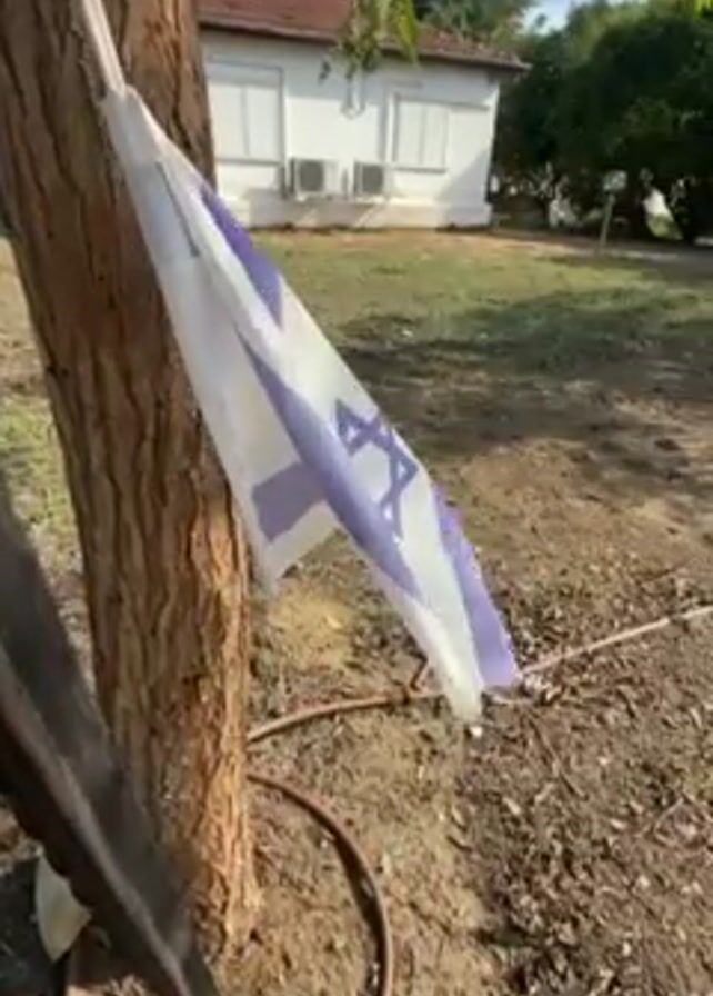 The camera focuses on an Israeli flag tied to a tree trunk in a yard