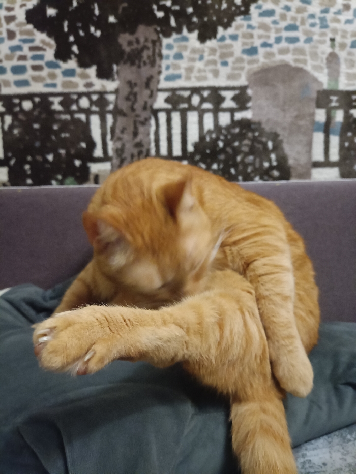 - "An orange tabby cat is grooming itself on a gray cushion, situated on a violet sofa" by FM-71LUI2, licensed under CC BY 4.0