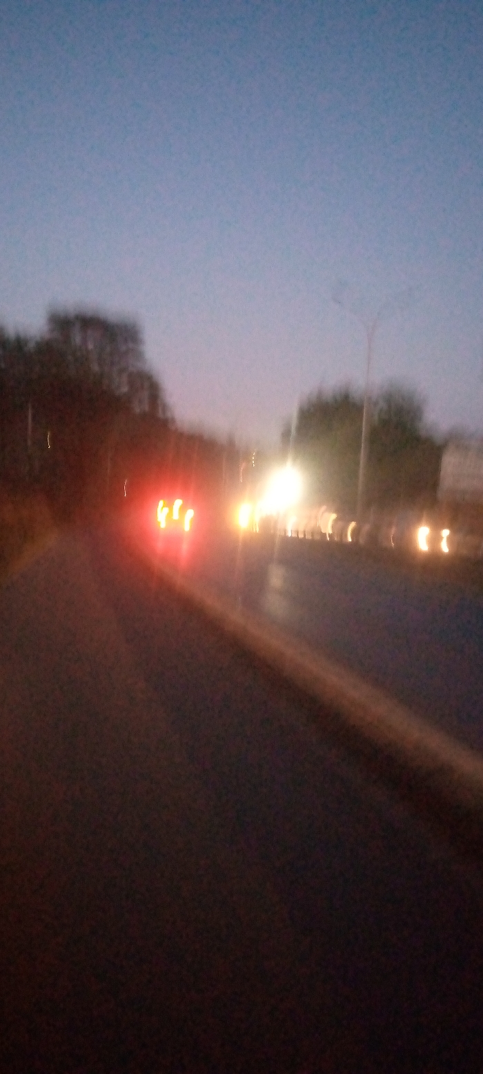 A blurry, low-light image shows a road at dusk or dawn. Red taillights appear blurred in the distance, while bright headlights approach from the opposite direction. Trees are visible on the left side of the road. Streetlights line the right side. The sky is a gradient of blue. The image suggests motion blur.