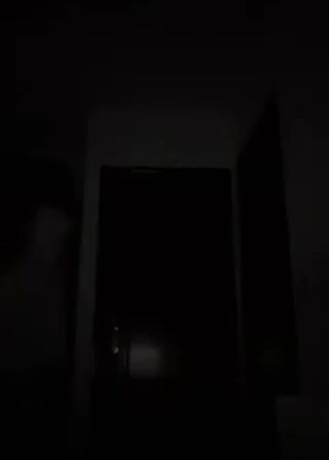 A person wearing a white hooded sweatshirt and a mask with a wide, disturbing smile stands in a dark room, illuminated by a light source coming from behind them. The background includes a partially open doorway and indistinct furniture. A sudden sound effect, possibly a scream, occurs as the person becomes visible.