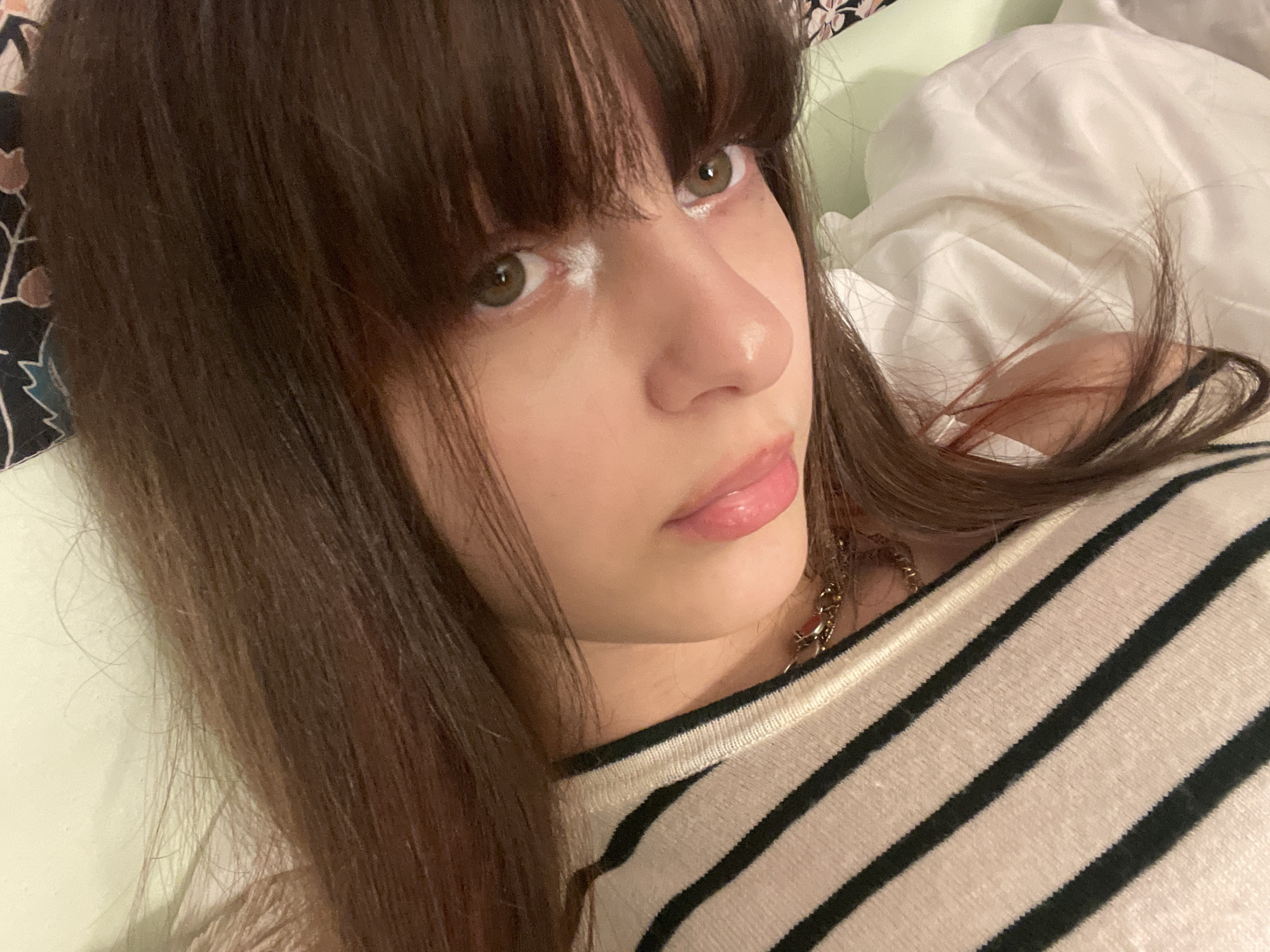A young person with brown hair and bangs is shown from the chest up. They are lying down, possibly in bed, as white bedding is visible in the background. The person wears a striped shirt (light with black stripes) and a necklace. The location is undetermined and unknown.