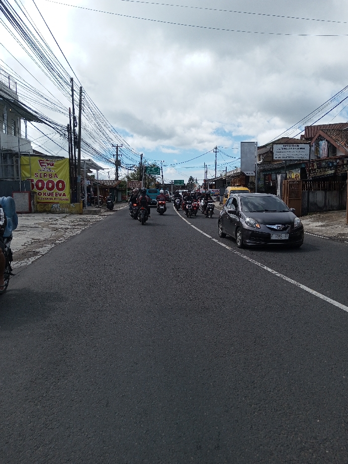 The image displays a two-lane asphalt road under a cloudy sky with visible blue patches. A solid white line delineates the center of the road. On the left side of the road, a multi-story building is partially visible, featuring a large yellow banner with "Eva" branding and Indonesian text reading "SERBA 1000" and "TOKO KUE EVA." A dense network of overhead utility wires extends from multiple poles along this side of the road. In the right lane, a dark gray Honda Brio hatchback with the Indonesian license plate F 1585 ZF is positioned, facing slightly towards the viewer. In the opposing left lane, a group of approximately 10-15 motorcyclists, wearing helmets and dark attire, are traveling away from the viewer in a convoy. Additional motorcycles are visible further down the road, alongside a light blue minivan in the mid-distance. The right side of the road is bordered by a series of single and two-story buildings, exhibiting a mix of architectural styles with some featuring tiled roofs. A green road sign is visible in the mid-ground above the left lane, with unreadable white text. The overall scene depicts a busy street in a town or urban area.
