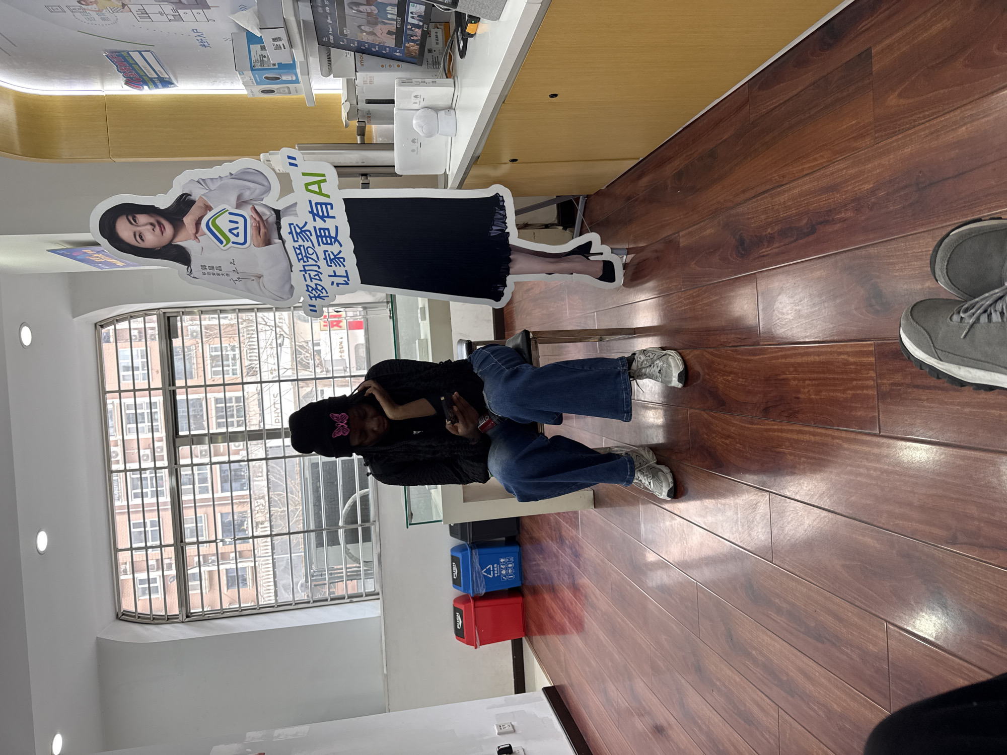 The image displays an interior scene of a commercial establishment in Daxing District, China. The floor is covered with polished reddish-brown wooden planks. In the immediate foreground, the lower legs and feet of a person wearing grey athletic shoes are partially visible. A second individual is seated on a dark stool in the mid-ground, facing slightly right. This person, attired in a black beanie with a pink butterfly embellishment, a dark long-sleeved top, and blue jeans, with white and grey athletic shoes, is actively engaged with a smartphone held in both hands; their right hand supports their chin. To the left, against a white wall, are three waste bins: one red, one blue with a recycling symbol and Chinese text, and one black. Electrical outlets are also present on this wall. Behind the seated individual, a large window fitted with horizontal metal grilles provides a view of a multi-story residential building with a reddish-brown facade, numerous windows, and several external air conditioning units. To the right, a large standing cutout of a woman is displayed. She wears a white blazer over a dark skirt and holds a house-shaped logo containing "AI" text. Chinese characters on the cutout identify the woman as "郭晶晶" and include text translating to "Mobile Smart Home, make your home more AI." Adjacent to the cutout, a light-colored wooden counter holds various electronic devices, including two white Huawei-branded units, a small white spherical camera, and a computer monitor displaying what appears to be a video conferencing interface with multiple participants. Recessed spotlights illuminate the white ceiling.