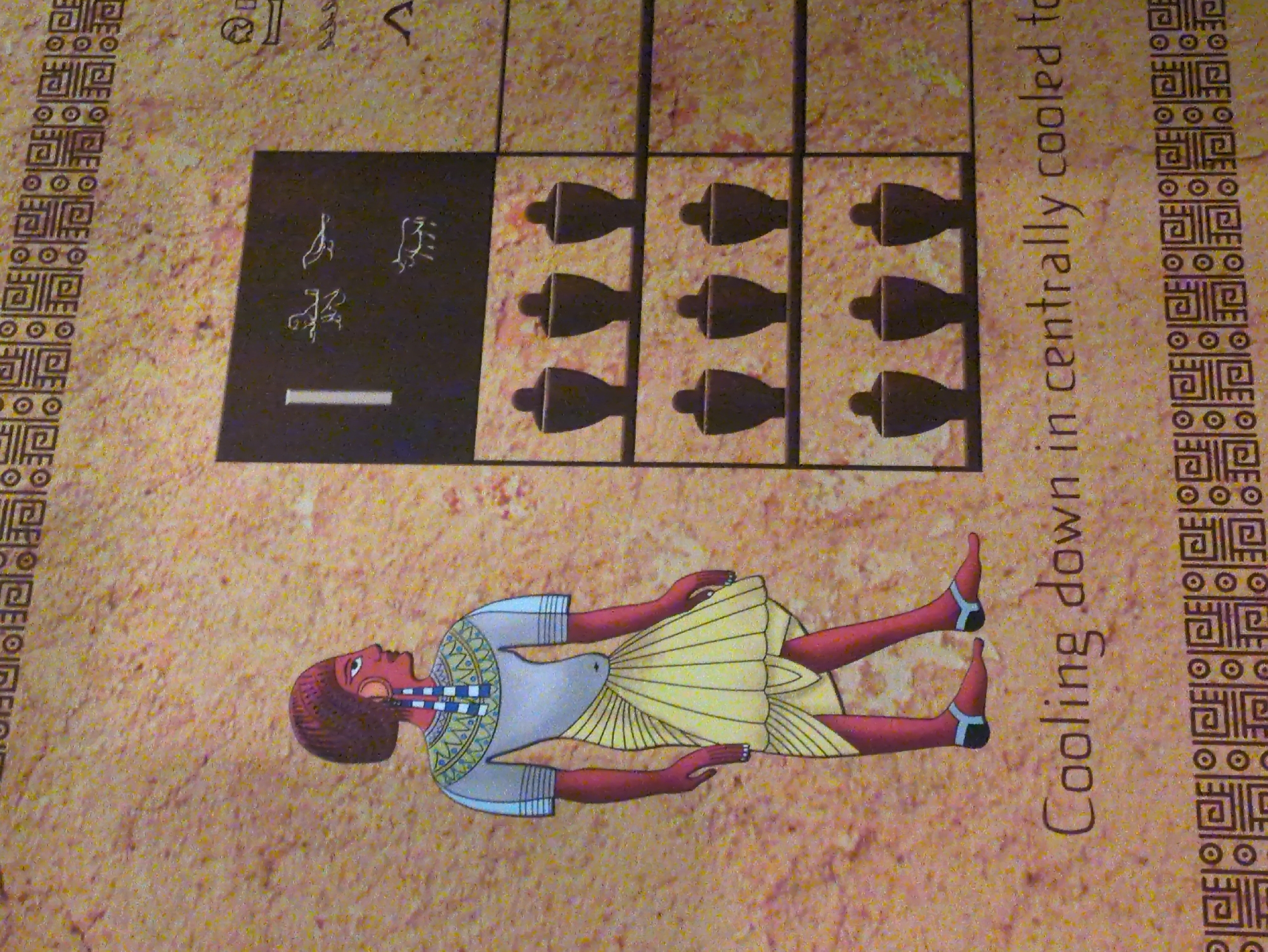 n Egyptian-themed scene, likely from a restaurant or establishment. There is an Egyptian figure lying down, a black rectangle with hieroglyphs, a grid pattern with vessel-shaped objects within each cell, and text that reads "Cooling down in centrally cooled to". The background is a textured yellow-brown, possibly resembling sand or papyrus. The presence of this theme suggests that this is located in a public space with commercial functions in Bengaluru, India.