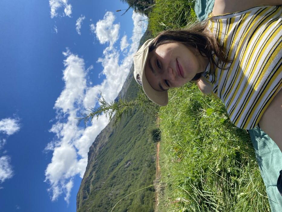 A young woman in a striped yellow and white top and beige baseball cap reclines in a field of tall green grass. Behind her, a large, forested mountain rises. The sky is bright blue with fluffy white clouds. The photo seems to be taken from a slightly angled perspective, potentially a selfie. The overall scene evokes a sense of relaxation and enjoyment of nature.