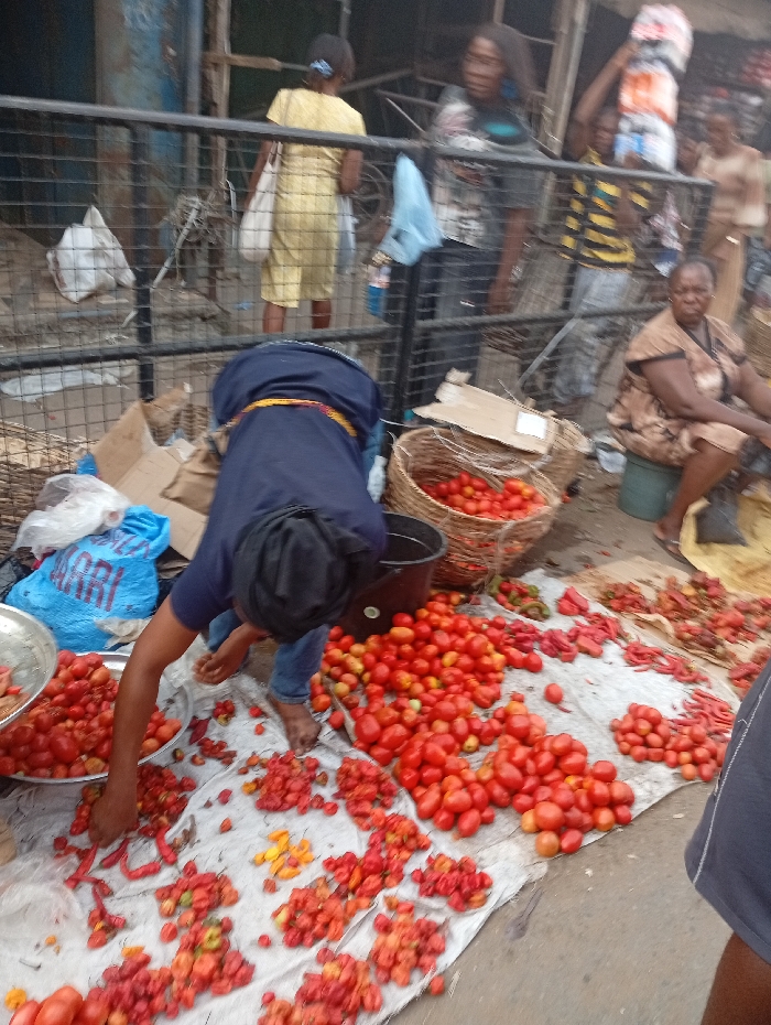 A bustling market scene unfolds with a vendor sorting through an array of ripe red tomatoes and chili peppers spread out on a white sheet. Other shoppers and vendors can be seen in the background, adding to the vibrant atmosphere. Some are standing behind a metal railing, while others are seated and engaged in selling their goods. Baskets filled with tomatoes indicate an abundance of fresh produce available for purchase.