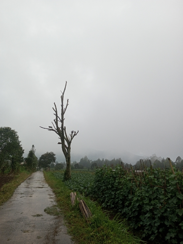 The image depicts a rural scene in Chagzam_Pam, Bhutan, under overcast and foggy conditions. A narrow, wet, paved road recedes from the lower-left foreground towards the upper-center, flanked by vegetation. On the right side of the road, a tall, denuded deciduous tree with numerous cut branches stands prominently in the midground. To the immediate right of this tree, a cultivated field extends into the distance, populated by rows of green, leafy plants supported by wooden trellises or stakes. Several cut wooden poles are stacked horizontally on the ground near the base of the prominent tree. The left side of the road is bordered by dense green foliage, including smaller trees and shrubs. The background reveals distant hills or mountains largely obscured by thick fog or mist, with silhouettes of forested areas faintly visible. The sky is uniformly light grey, indicating heavy cloud cover. No individuals, animals, or vehicles are present.