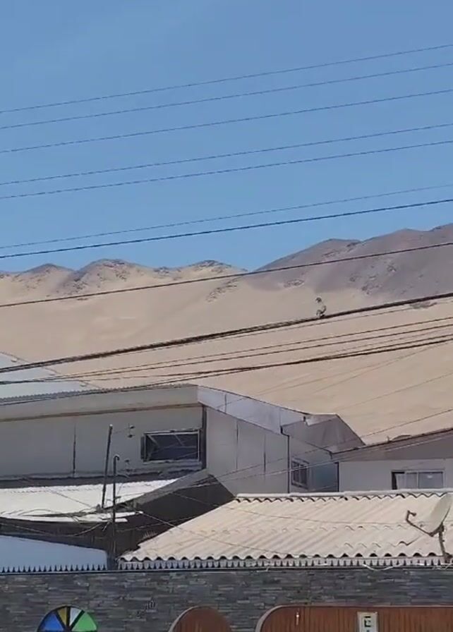 residential street scene on a bright, sunny day. The camera is positioned at street level, looking across the street towards a row of houses. Each house is fronted by a fence or wall with gates, and the style of architecture varies. A blue car is partially visible on the right edge of the frame. Overhead, power lines stretch across the sky. In the distance, behind the houses, a sandy dune or small mountain range is visible. A bird is perched on the power line. The overall setting appears to be a semi-arid or desert-adjacent area.