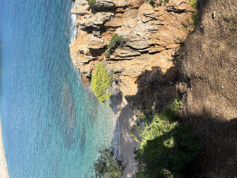 This image depicts a coastal scene in Lloret de Mar, Spain, viewed from an elevated perspective overlooking a rocky coastline and the Mediterranean Sea. In the upper portion of the frame, the turquoise-blue sea extends to the horizon under clear skies. In the far distance, a wide sandy beach is visible, populated by numerous individuals, and marked by several yellow buoys floating in the water. The mid-ground features a rugged, reddish-brown rocky cliff face that descends into the sea. At its base, a small, secluded sandy cove is visible with clear, shallow water. A blue and green object, possibly a towel or bag, lies on the sand in this cove. Green shrubbery and trees dot the rocky outcrops and the edges of the cove. On the lower right section of the prominent cliff face, a solitary individual is visible. This person appears to be a female, wearing light-colored clothing (possibly a white top and dark bottoms), positioned in a shaded crevice of the rocks. Her posture suggests she is either ascending, descending, or resting on the rocky terrain. The immediate foreground consists of dry, earthy ground covered with pine needles, fallen leaves, and small branches, indicative of a natural, possibly forested, clifftop area. Large shadows are cast across the foreground and portions of the cliff face, indicating a distinct light source, likely the sun, from the upper left.