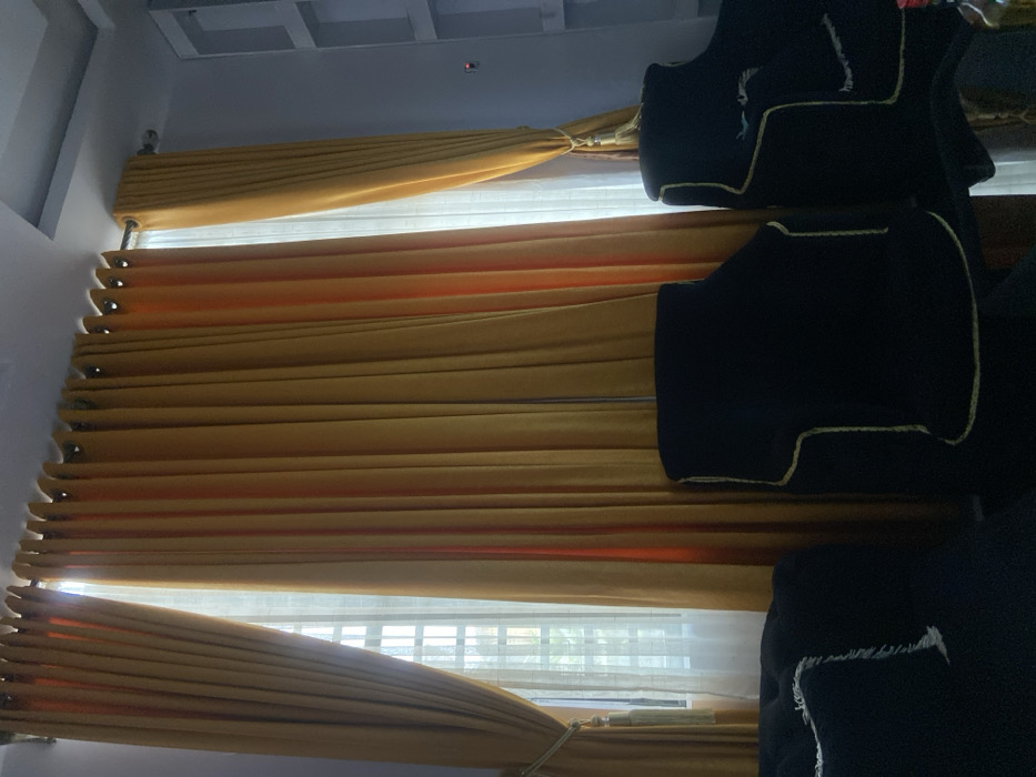 This image depicts an interior room, likely a living space, which cannot be definitively located in Alor, Nigeria based solely on visual evidence. The scene is dominated by a wall of floor-to-ceiling yellow-gold curtains, hung from a metal rod with grommets. These opaque curtains are partially drawn back on both the left and right sides by matching tie-backs with tassels, revealing sheer white curtains and windows behind them. Vertical window bars are visible through the sheer curtains. In the foreground, two dark-colored armchairs, possibly black or dark blue, with distinct gold or light-colored trim outlining their shapes, face towards the viewer from the right half of the frame. To the far left, a section of another dark-colored piece of furniture, possibly a sofa, is visible, topped with a cushion featuring white fringe. The ceiling above is white with architectural detailing. On the right wall, a recessed multi-tiered shelf unit or architectural feature is visible, along with a small red indicator light. In the bottom right corner, a portion of a glass bottle is visible on a surface. No individuals or specific interactions are present in the image.