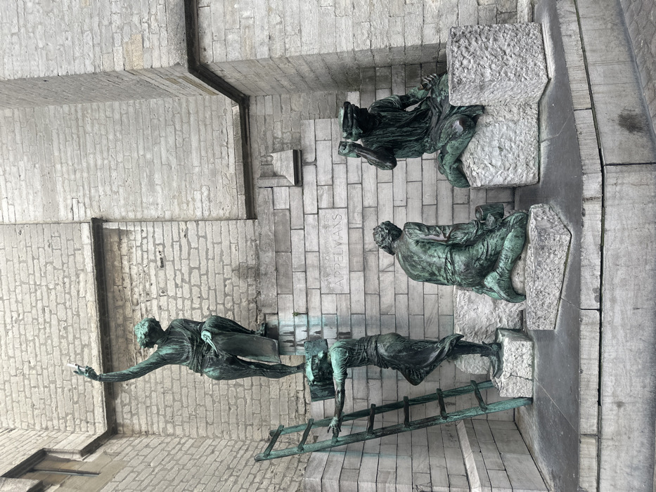 This image depicts a bronze sculptural group located on the exterior wall of the Cathedral of Our Lady in Antwerp, Belgium