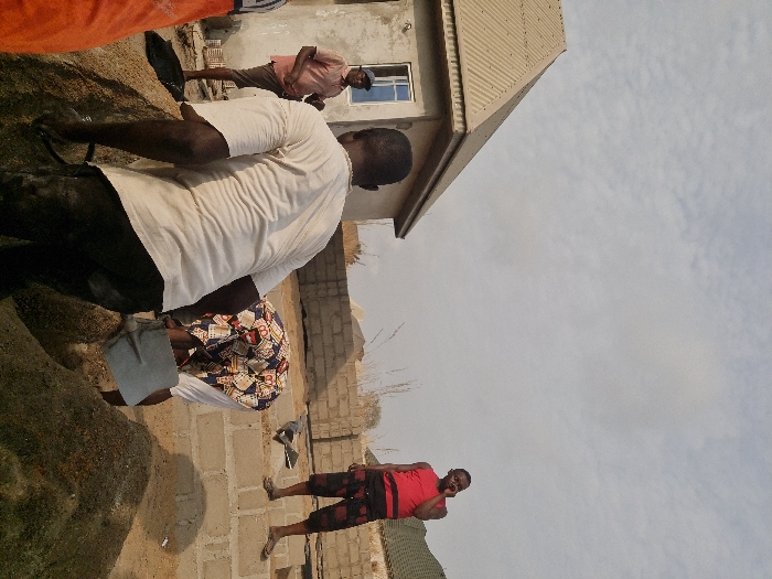Several people are outdoors during daylight. One person wears a white shirt and dark pants. Another individual is in a red shirt with dark shorts. A third person wears a pink shirt and dark pants. Others are partially visible. They are near a building with a corrugated metal roof and a window. The ground appears to be a mix of grass and exposed earth, with some brick or concrete structures present. The sky is visible in the background.