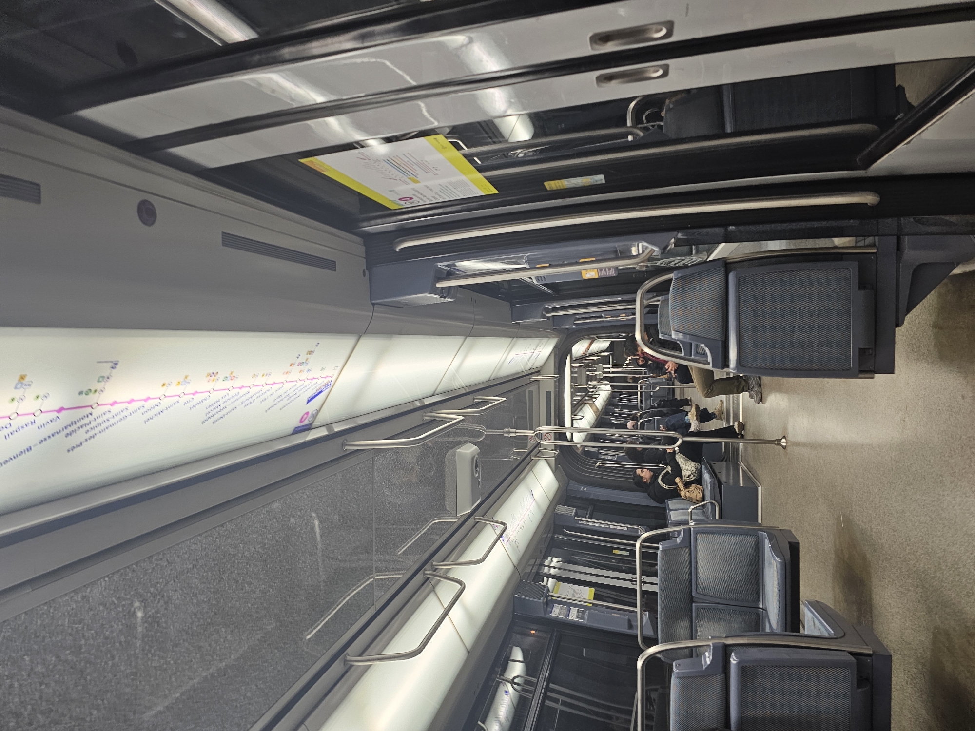 interior of a Paris Metro train. The car is gray with blue fabric seats. Passengers are visible, sitting and standing. Route map is on the wall above the windows. The train is well-lit.