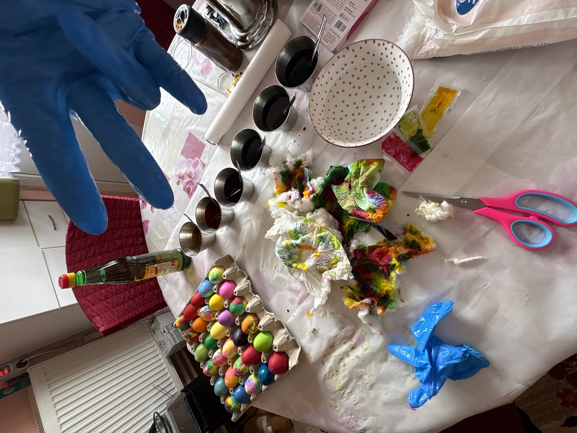 The scene depicts a table set for dyeing Easter eggs in Dve Mogili, Bulgaria. An open egg carton filled with colored eggs sits on the lower left. Six small metal cups containing dye are arranged in a row, with spoons inside. To the right of the dye cups are crumpled, dyed tissues and a pair of pink and blue scissors. Various containers and dye packets are scattered across the white-covered table. A gloved hand reaches into the frame from the upper left. A bottle lies near the egg carton.