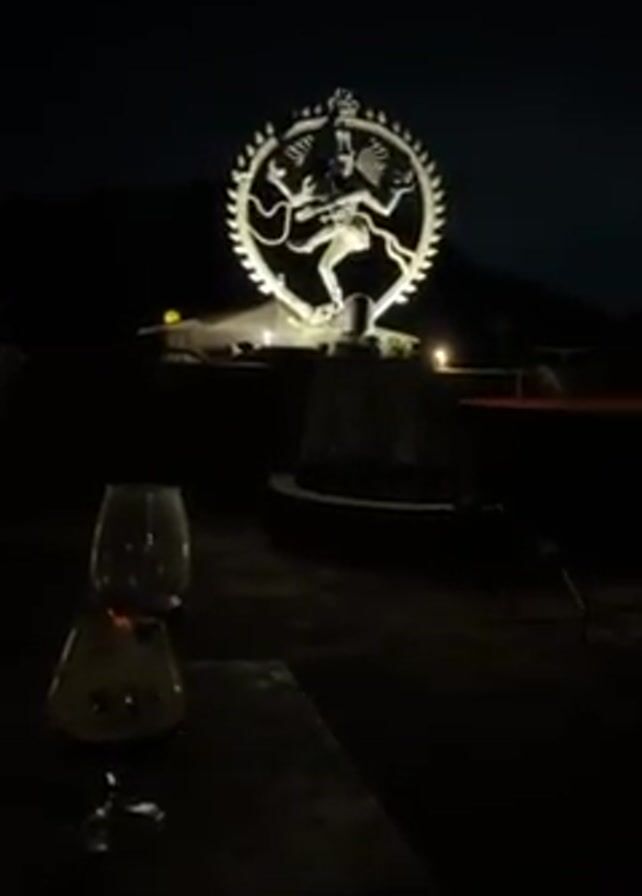 The video showcases a statue of the Hindu god Shiva in the Nataraja pose, illuminated at night. The statue is set against a dark background with what appears to be a mountain range in the distance. The statue is encircled by a ring of light. A table with glasses is visible in the foreground, implying an outdoor setting with seating. The camera gradually zooms in on the statue, focusing on the details of the deity's form and the surrounding ring.