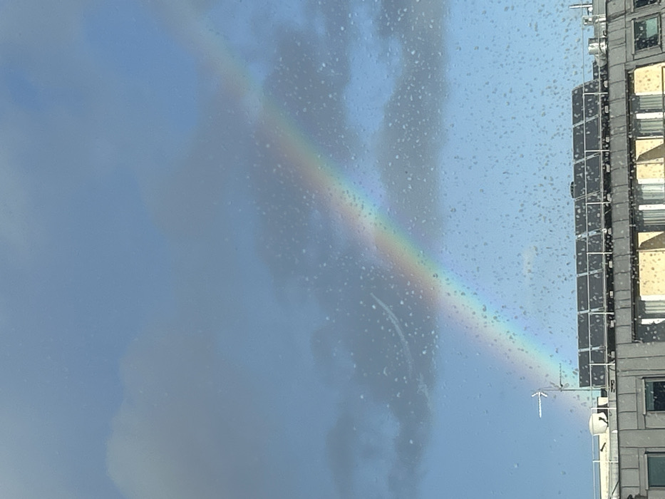 - "The image captures a partial rainbow arcing across a cloudy blue sky, viewed through a wet surface, likely a window, evidenced by numerous water droplets diffusing the light" by FM-joMVs2, licensed under CC BY 4.0