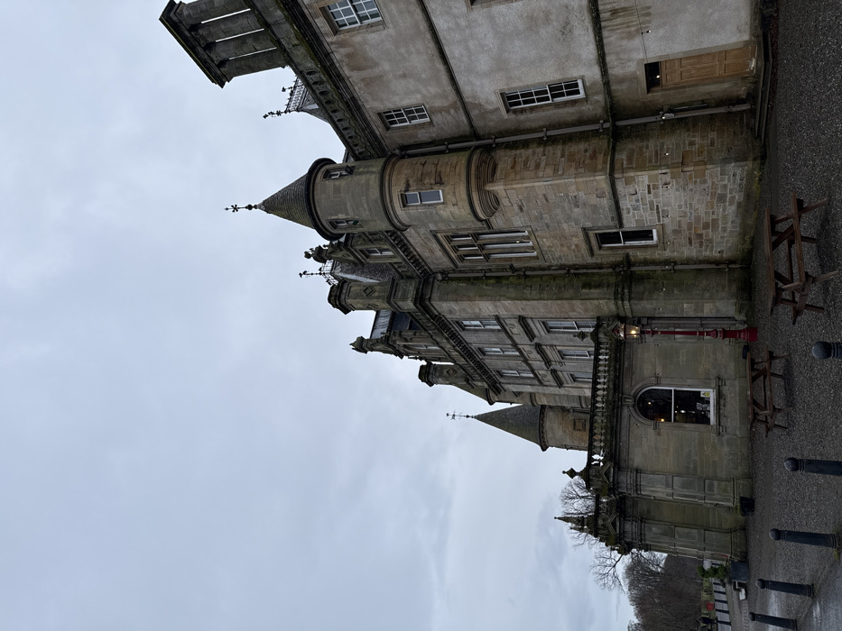 An ornate, multi-story stone building stands against a gray sky. It features pointed turrets, many windows of varying sizes, and decorative stonework. Adjacent to the building are wooden picnic tables. Dark posts line the area near the building's base. The overall scene appears overcast and historical.